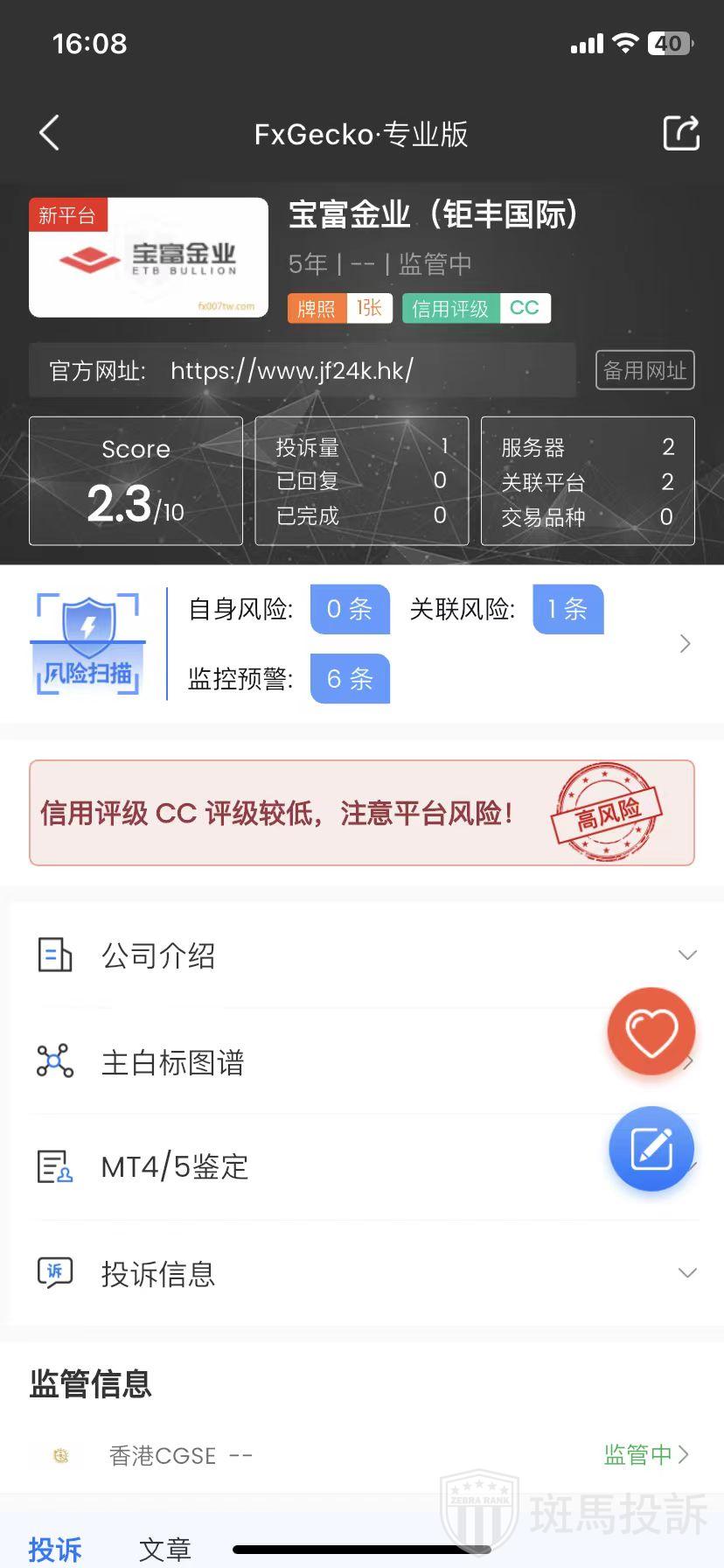 宝富金业ETB Bullion,在FxGecko APP显示1家监管牌照。持有的香港CGSE监管状态为监管中!