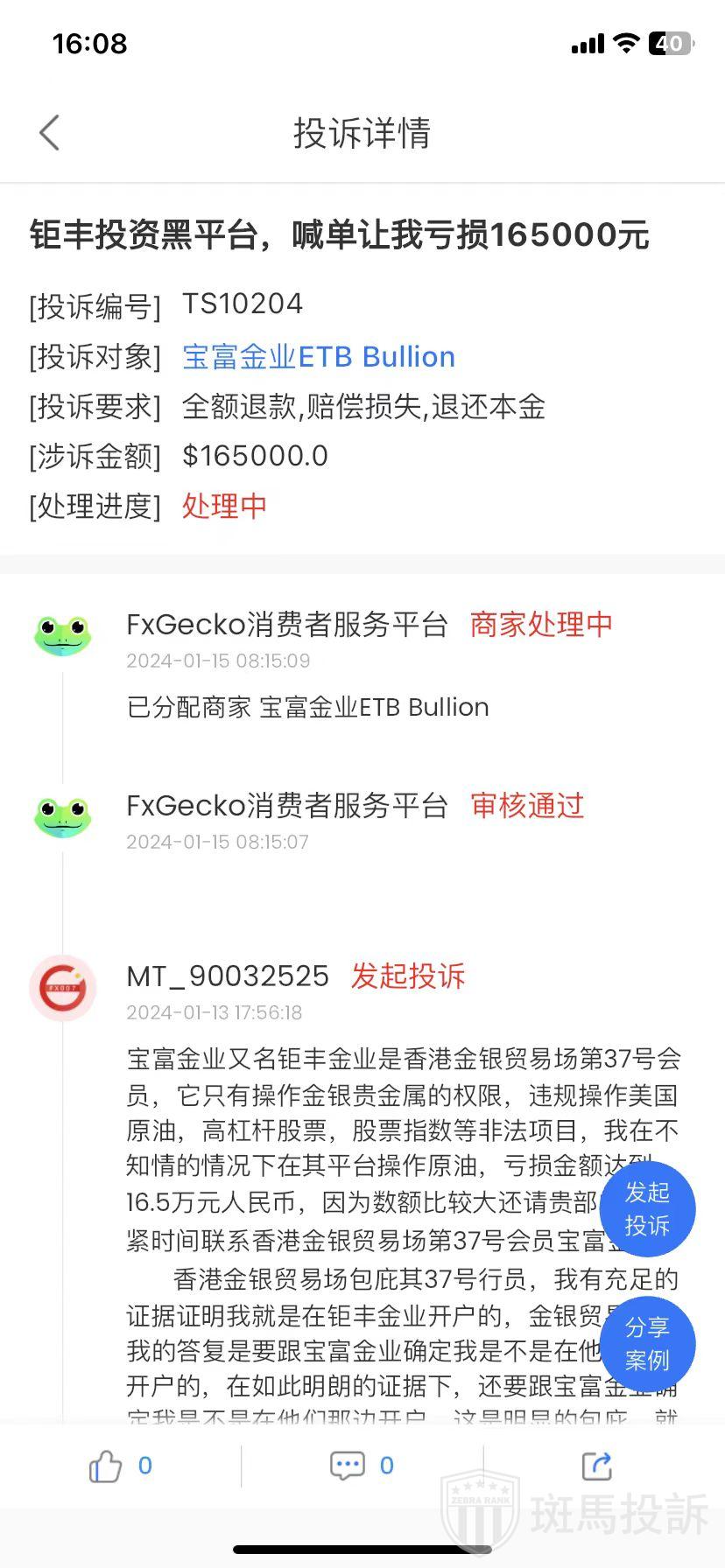 最近,有投资者通过FxGecko APP投诉宝富金业ETB Bullion黑平台,喊单让我亏损165000元。