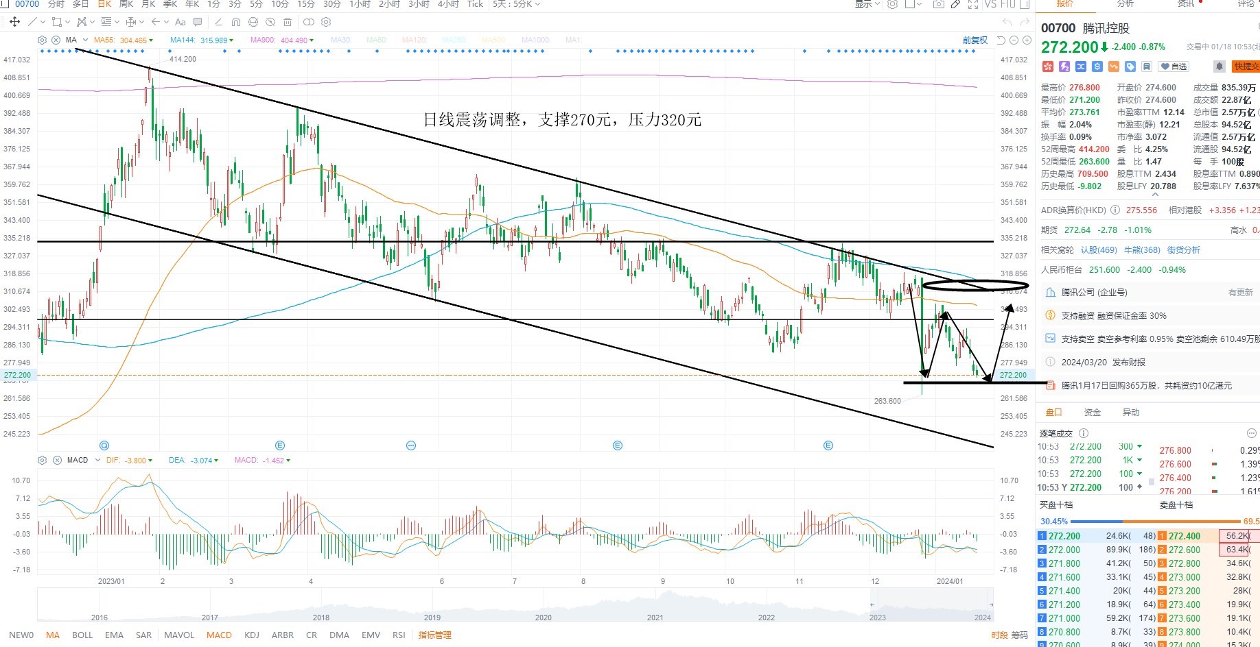 腾讯控股短期维持回踩,但没有跌破前期低点支撑,市场流动性进一步走弱,且指数尚未走出左侧区间,因此情绪尚未共振之前,权重很难突破下降趋势线,日内等待企稳低吸机会,下方多空分水岭270元,上方压力320元