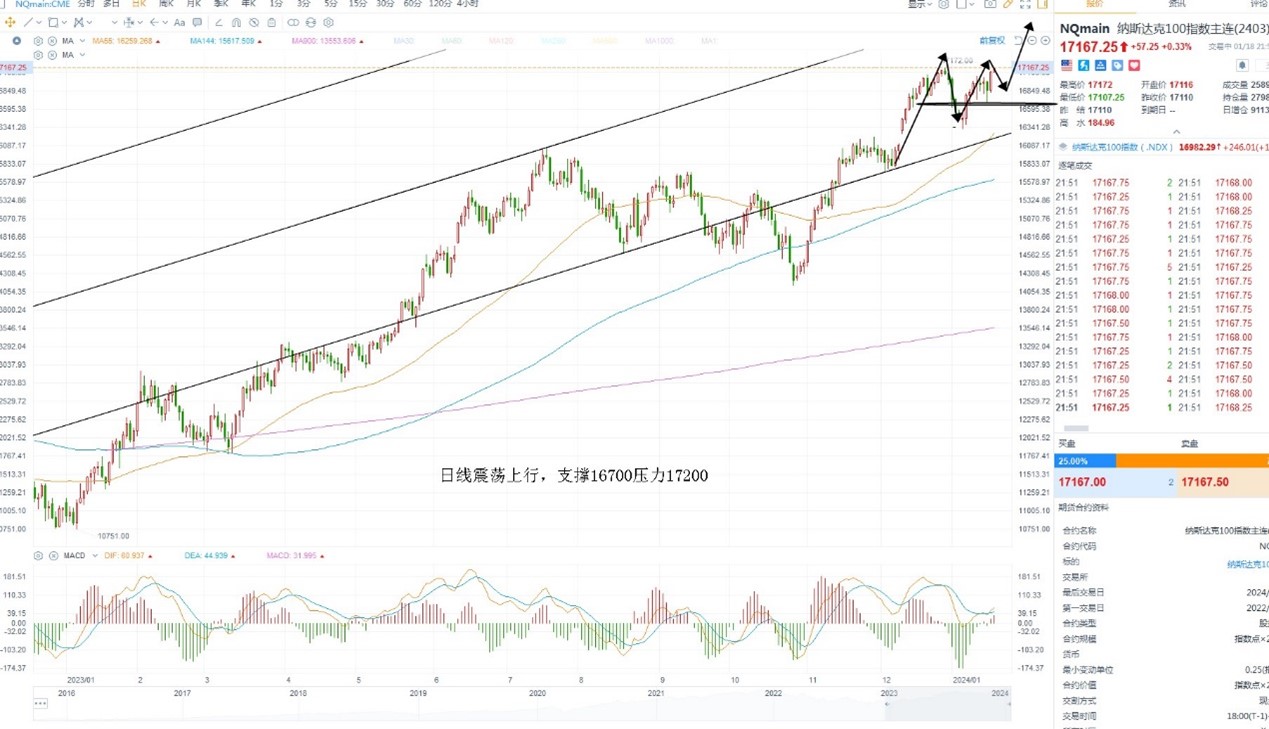 纳斯达克指数继续走高,短期再创新高,但多头趋势尚未出现加速,因此更多的是震荡上行,结构上需要等待站稳前期高点之后的加速机会,日线级别回踩16700附近不破低吸,上方突破17200则有望进入多头加速区间