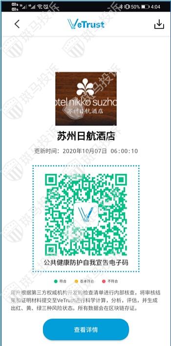 通过唯链科技的一站式区块链数据服务平台VeChain ToolChainTM为唯信提供安全、稳定的底层区块链技术支持。其中,通过VeChain ToolChainTM的数据呈现模块,酒店可以公开自身“绿码”,将各关节防疫工作完整、透明地公布给大众,增进品牌形象及信任度。所有扫码核实的消费者都能获得更多安心细节。