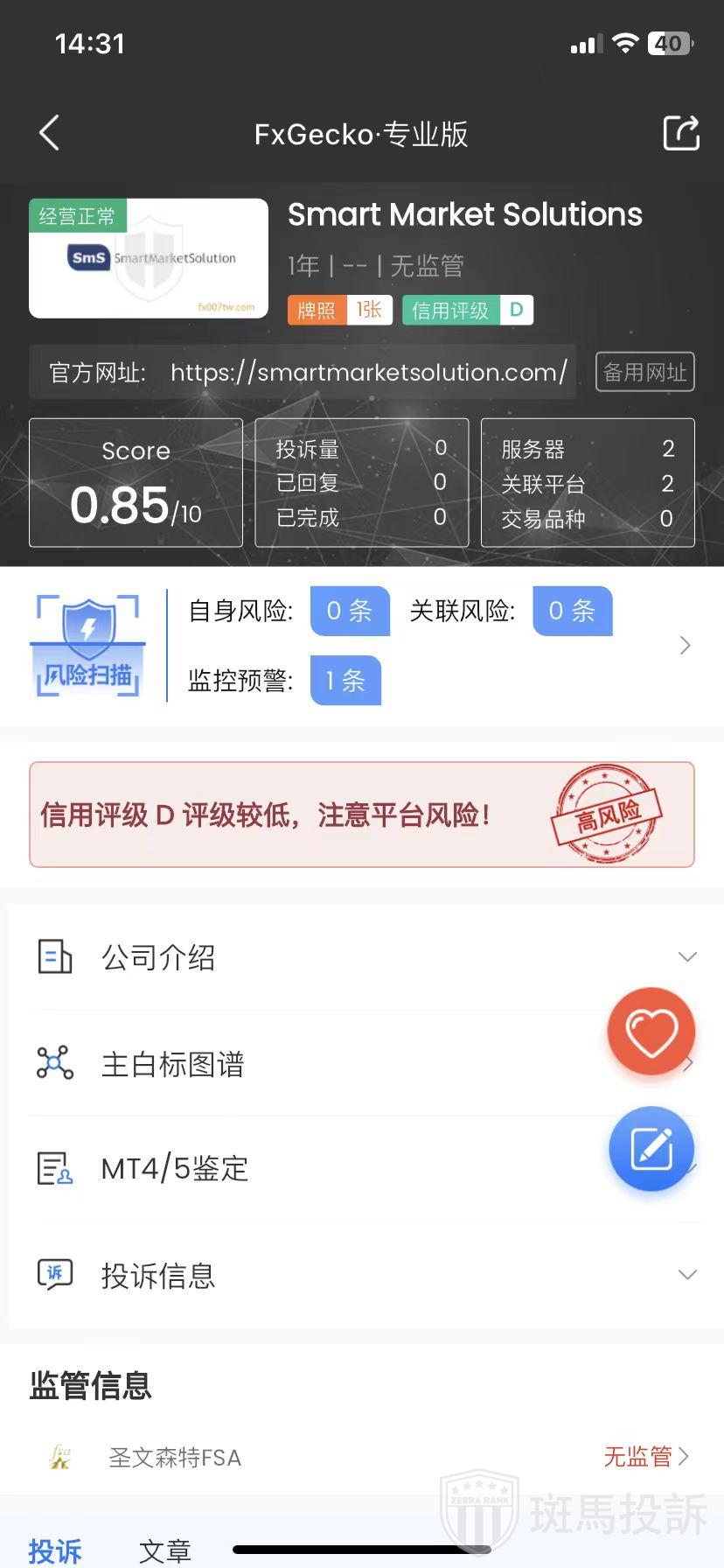 Smart Market Solutions,FxGecko评分0.85分,信用评级较低,建议投资者远离!