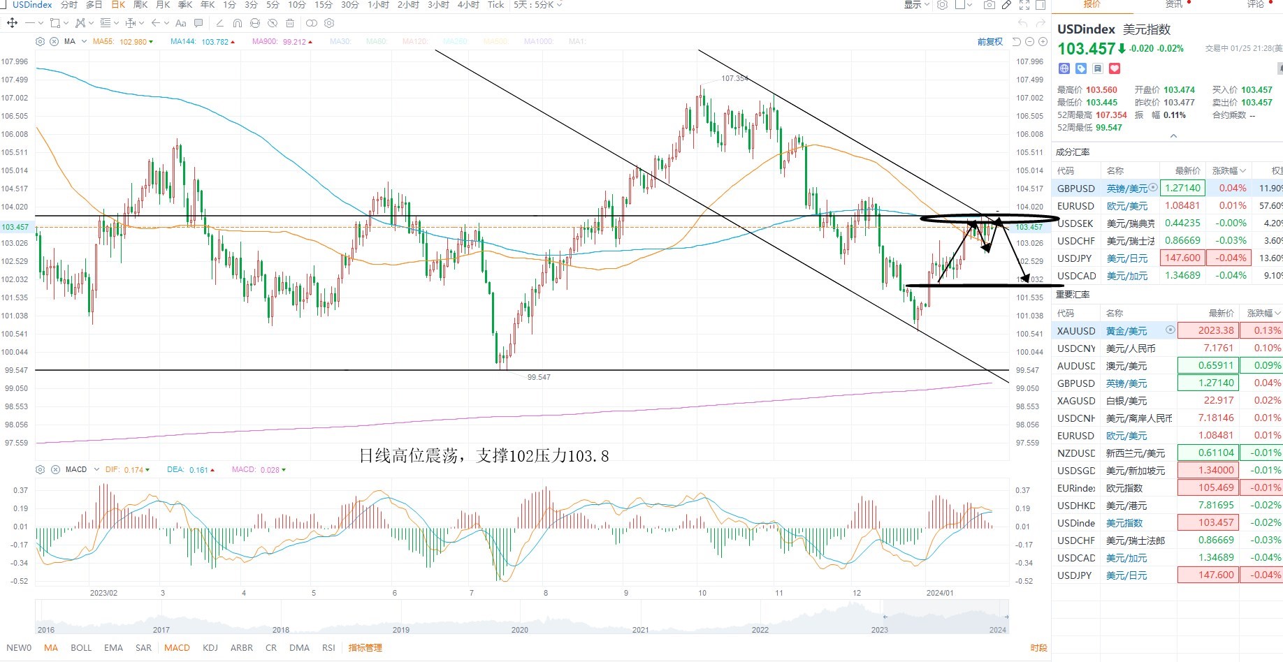 美元指数维持高位震荡,短期结构并未出现明显的变化,而下降趋势线始终未能突破,叠加降息预期修正之后,短期不排除再次下行的可能性,日内等待沽空机会为主,金价方面短期维持低位震荡,徘徊于2000美元附近,结构上等待企稳之后的低吸机会,中期方向维持多头运行不变,美原油震荡走高,测试通道压力,不过基本面并未反转,因此结构上等待压力测试为主