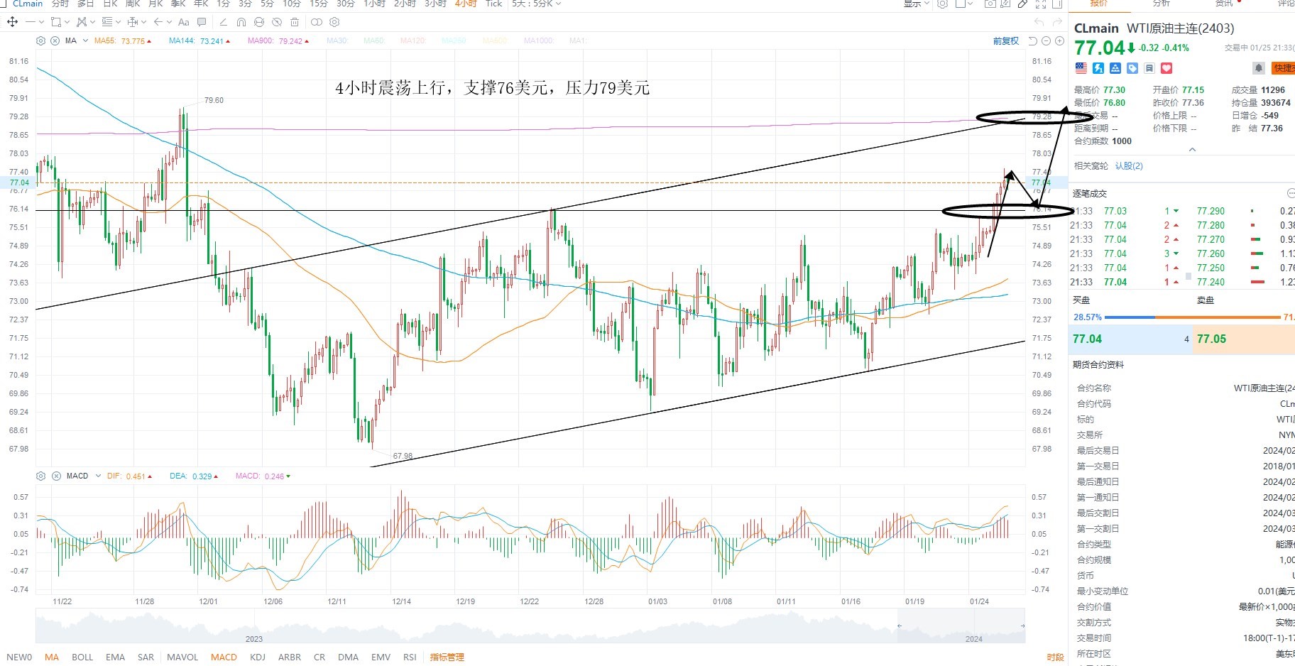 美原油震荡走高,短期突破箱体压力之后有望继续测试短期通道压力,不过目前基本面上并未出现明确的反转迹象,受制于需求端的压力中期空头结构不变,但供给端意外下降,支撑油价小幅走高,日内等待回踩确认为主,下方支撑76美元,上方压力79美元