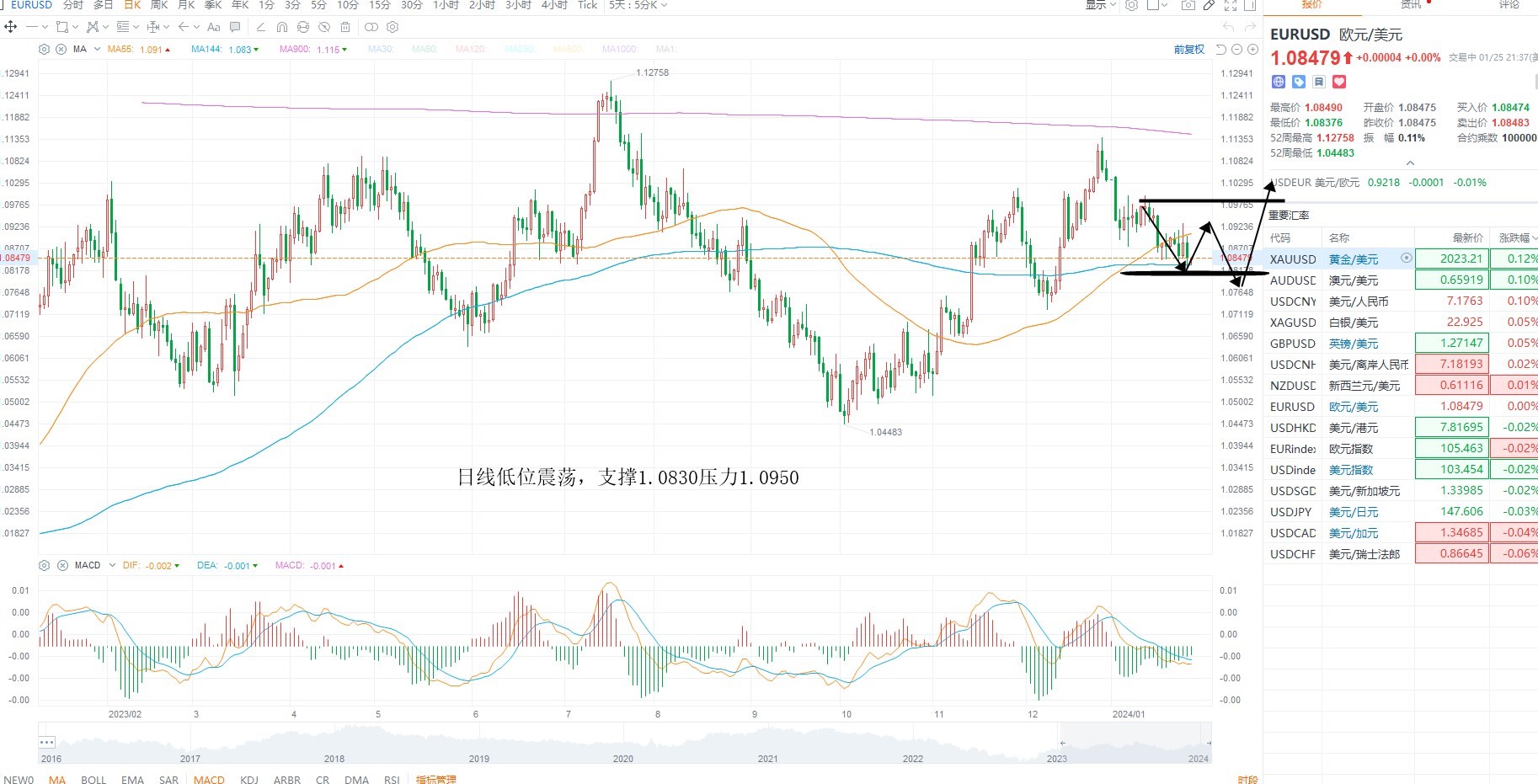 欧美维持低位震荡,目前并未跌破长期均线支撑,基本面上美元指数受美联储降息预期修正影响,没有突破下降趋势线之前,等待方向选择为主,非美低位盘整不破,则有望继续反弹,欧美日线级别支撑1.0830附近盘整不破,等待低吸,上方压力1.0950附近