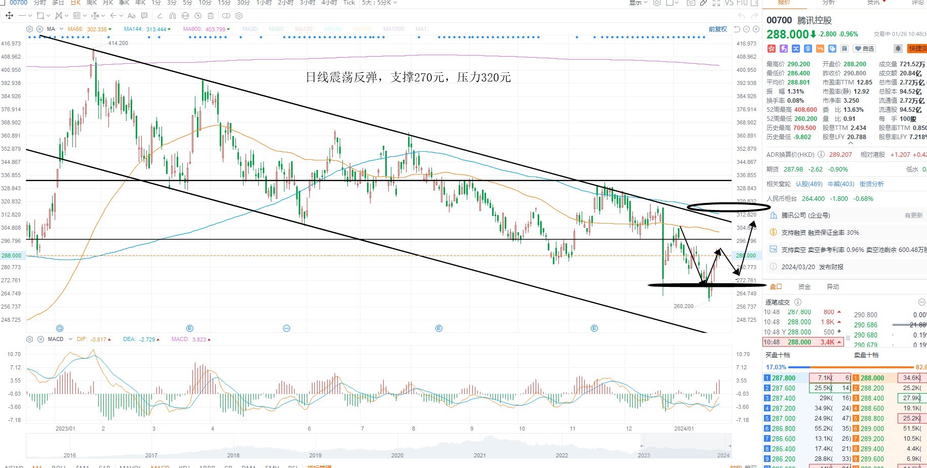 腾讯控股短期维持震荡反弹,不过这里依然是下跌之后的修正,在没有突破下降趋势线之前,等待企稳低吸,切勿追涨,继续关注指数级别共振,是否形成流动性回暖之后的突破,日线级别支撑270元附近,上方压力320元