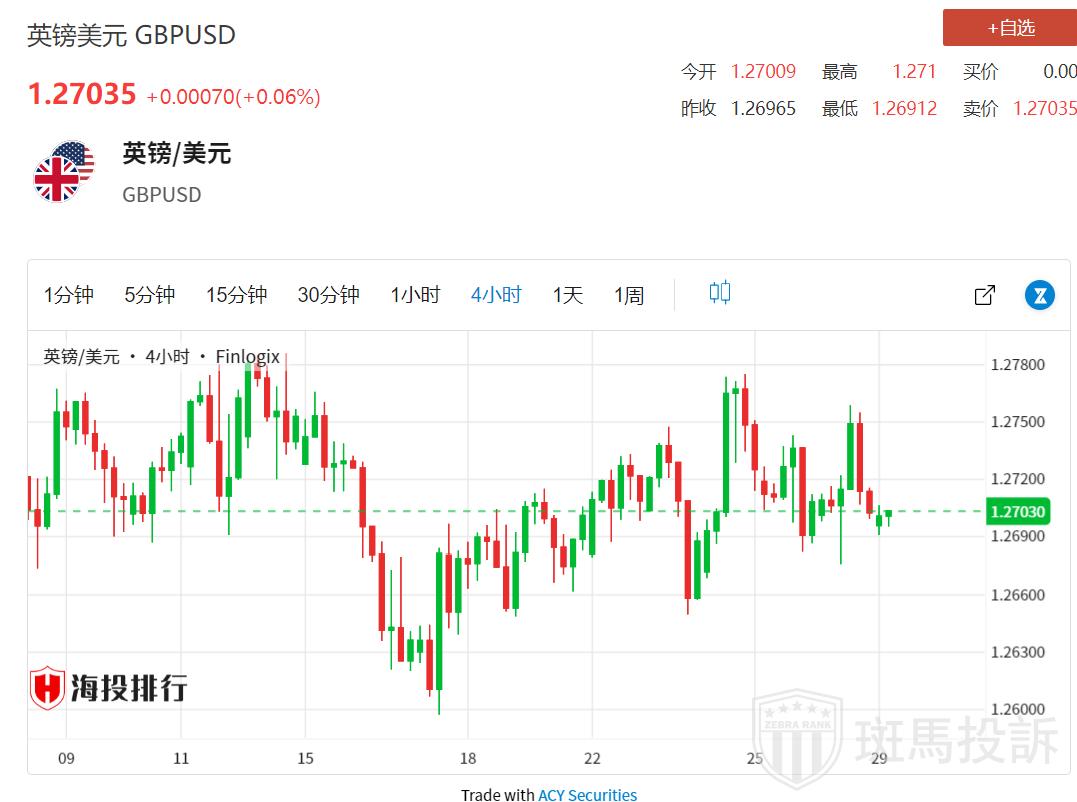 周一亚市,英镑/美元下跌后走高,但缺乏跟进,仍维持在过去两周左右的震荡区间内。英镑/美元目前交投于1.2700关口附近,全天几乎波动不大,因为交易员们在等待新的催化剂,然后再为坚定的近期趋势设立头寸。