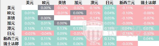 下表显示了今日澳元兑上市主要货币的百分比变化。澳元兑日元汇率最强。澳元在风险厌恶情绪中上行