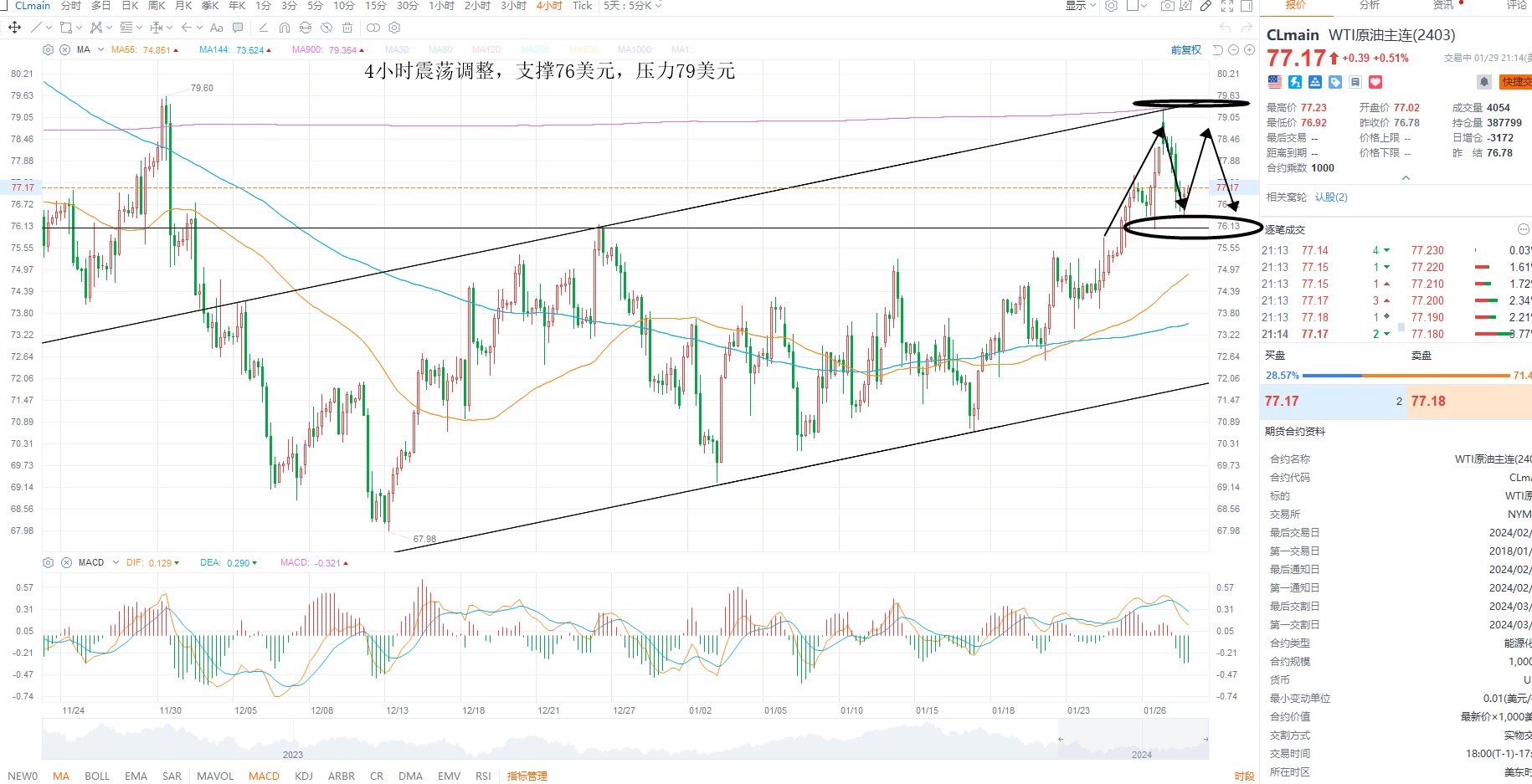 美原油冲高回落,短期依然是箱体震荡,测试通道压力之后回落,基本面上继续走强的概率不大,因中期需求端的增速依然是限制油价向上的重要因素,继续关注供给端的变化,是否支撑油价短期反弹,目前4小时级别多空分水岭76美元不破,则存在继续反弹的可能性,上方压力79美元附近
