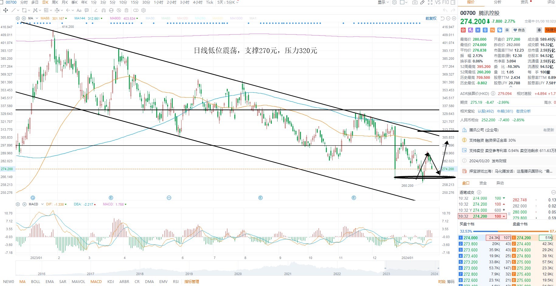 腾讯控股二次回踩,跟随指数再次回踩前期低点,目前市场风偏下行,且流动性不支持权重共振,短期等待企稳为主,继续关注指数是否存在二次向上突破下降趋势线的可能性,日内支撑270元附近,企稳低吸,上方趋势线压力320元附近