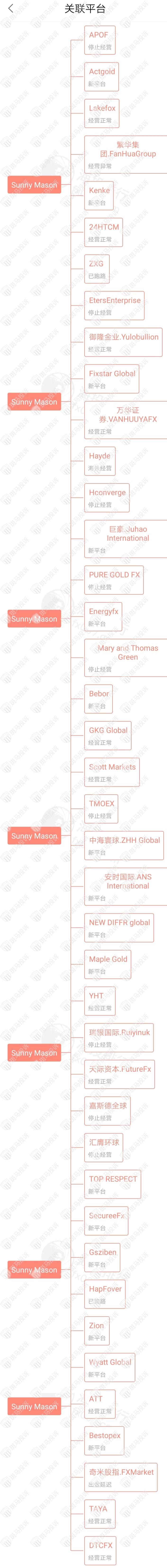 主白标关系显示,Sunny Mason平台和41家平台是一家公司,从他们的服务器地址,网站的模板来看,都可以看出来相似的地方。其中这APOF、EtersEnterprise、Hconverge、PURE GOLD FX、Mary and Thomas Green、TMOEX、瑞银国际.Ruiyinuk、嘉斯德全球、汇膺环球这9个平台已停止经营;ZXG、HapFover已跑路;奇米股指.FXMarket出金延迟;繁华集团.FanHuaGroup经营异常。
