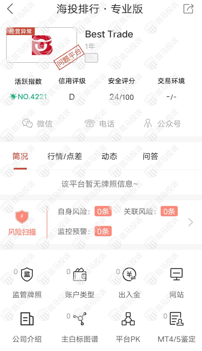 这家平台叫Best Trade,成立于2021年,全球排名4071名,目前无监管,没有外汇牌照,不能做外汇保证金交易,投资者资金安全无保障且经营异常。