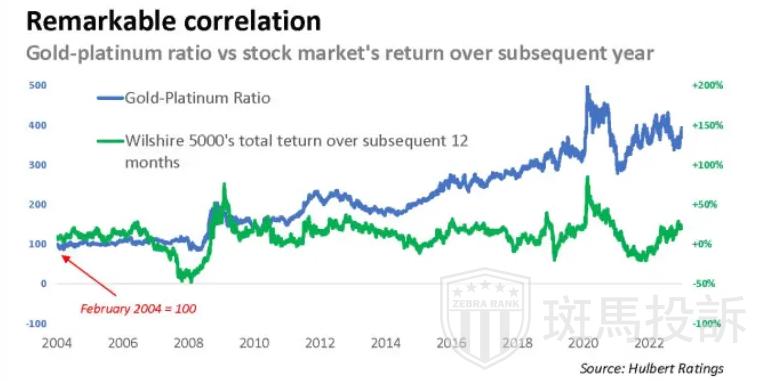 金铂比是美国康奈尔大学前金融学教授Darien Huang和南加州大学金融学教授Mete Kilic提出的,他们于2019年在《金融经济学杂志》上发表的题为“黄金、铂金和预期股票回报”中,指出当金铂比处于强劲的上升趋势时,美股在接下来的12个月内往往会上涨,反之亦然。