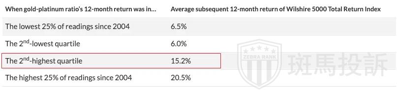 这是个好消息,因为当前的金铂比位于历年来的第二个四分位值(排名50%-75%这个区间),这预示未来12个威尔逊5000指数(Wilshire 5000 Index)或增长15.2%。