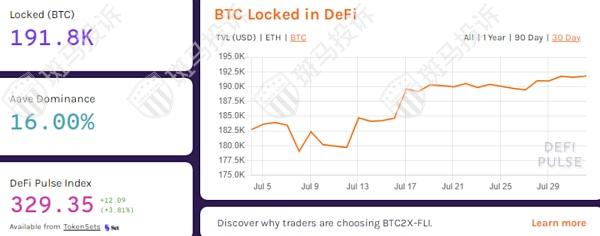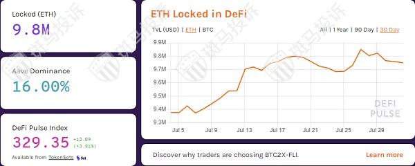 在过去的30天里,已经有474000 ETH和9071 BTC转移到DeFi。在下面的DeFi Pulse图中可以更清楚地看到这一点。