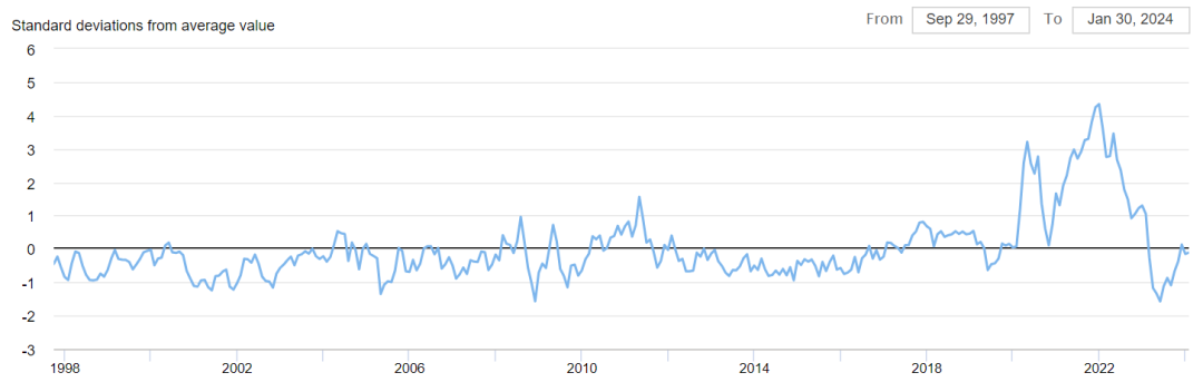 图:纽约联储的供应链压力指数有反弹,但仍处于0以下
