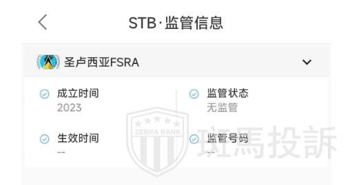 STB平台称在圣卢西亚正式注册,根据查询,并没有任何有关平台的信息,并且圣卢西亚FSRA本身就不具备监管外汇的职能,该平台没有有效的金融监管,建议投资者投资需谨慎。