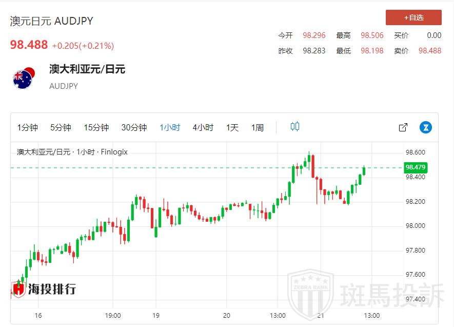 澳储行公布会议纪要后,澳元兑日元走强,澳元/日元连续第六个交易日上涨。周三亚市,澳元/日元走高至98.40附近。