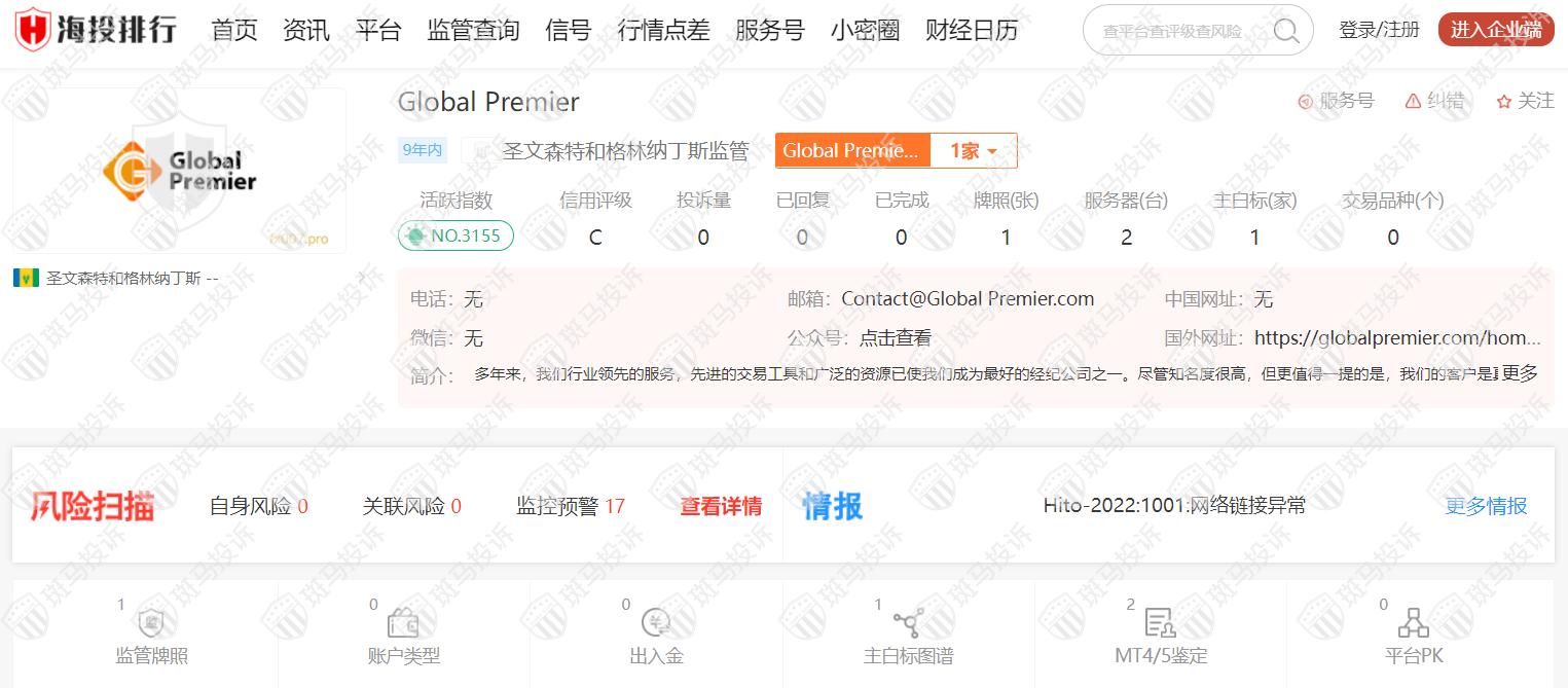 这家平台叫Global Premier,成立于2020年,全球排名3155名,无监管,没有外汇牌照,不能做外汇保证金交易,风险扫描显示17条风险,投资者资金安全无保障。