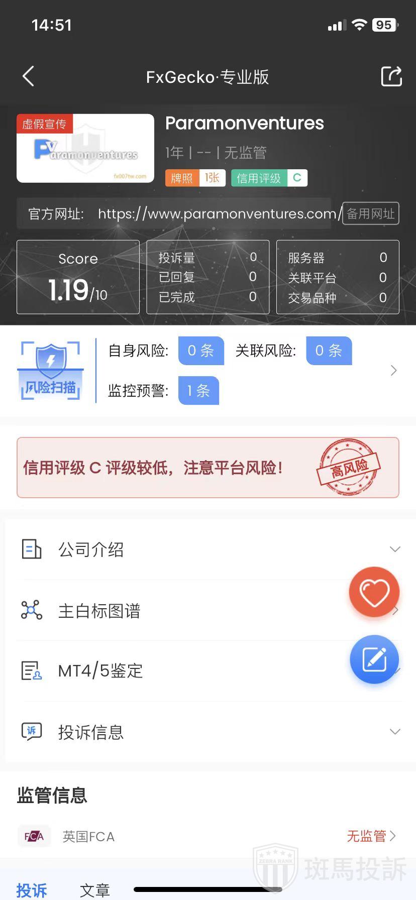 Paramonventures,在FxGecko显示1家监管信息。持有的英国FCA监管状态为无监管。投资者资金安全无保障!