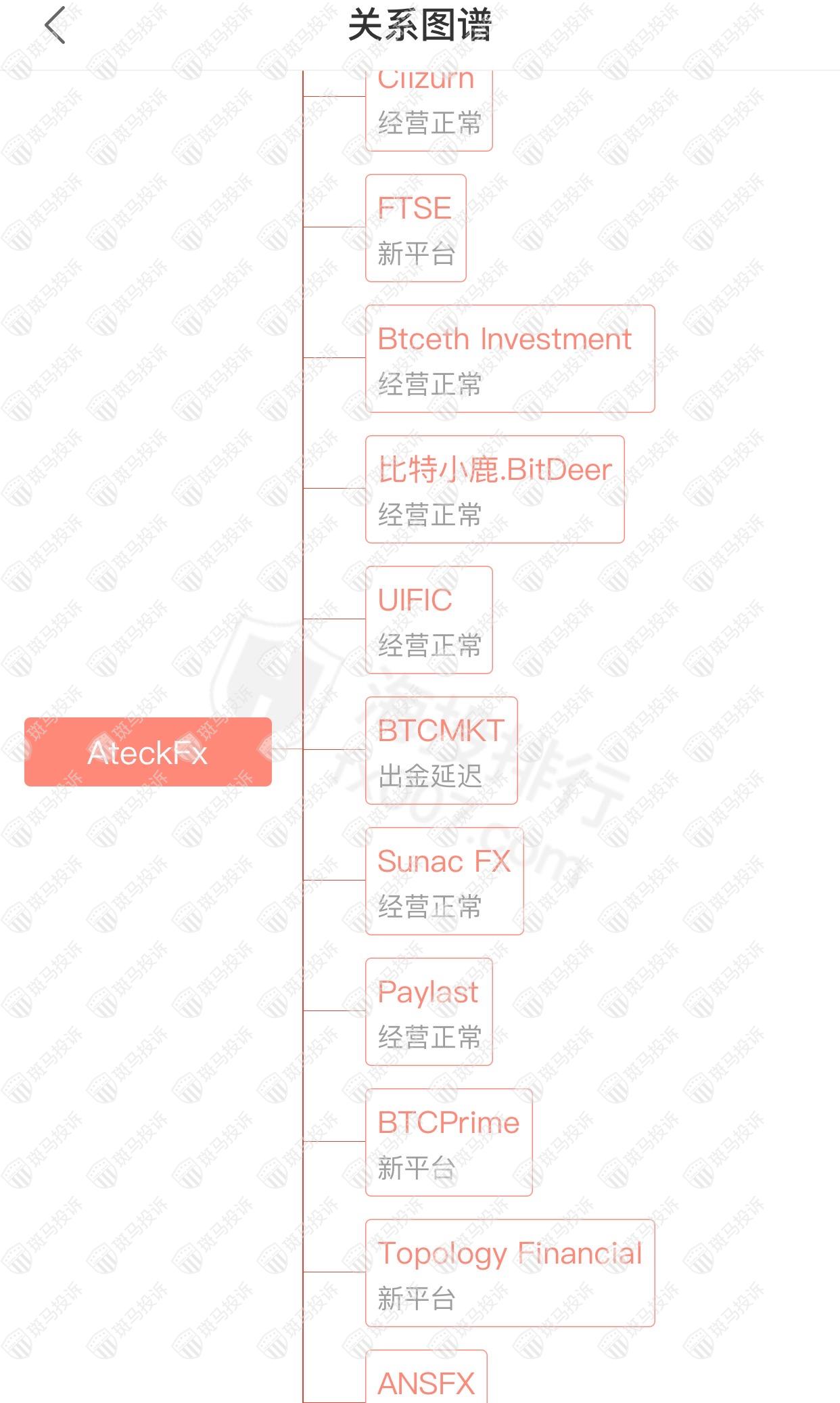 主白标关系显示,AteckFx平台和42家平台存在关联,其中一家BTCMKT平台出现出金延迟的情况。