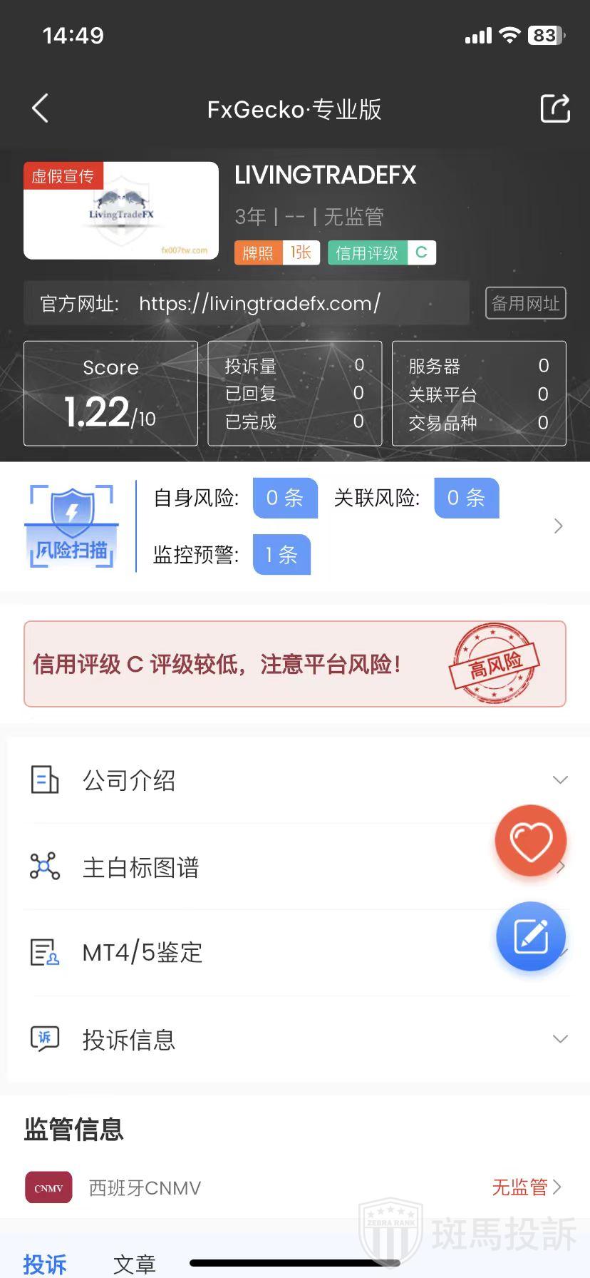 LIVINGTRADEFX,FxGecko评分1.22分,信用评级较低,建议投资者远离!