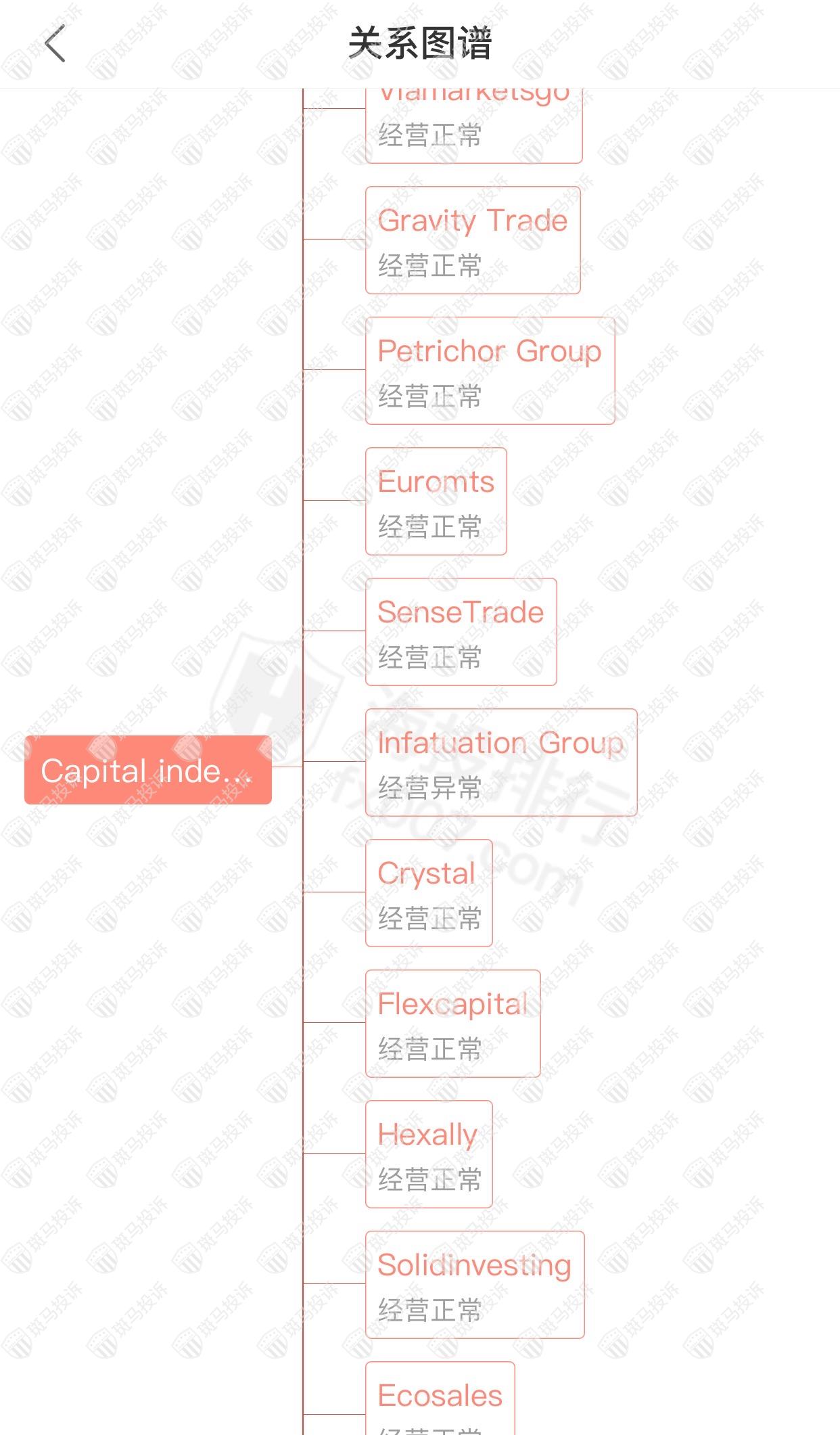 主白标关系显示,Capital index Fund平台和14家平台存在关联,其中一家出现经营异常的情况。
