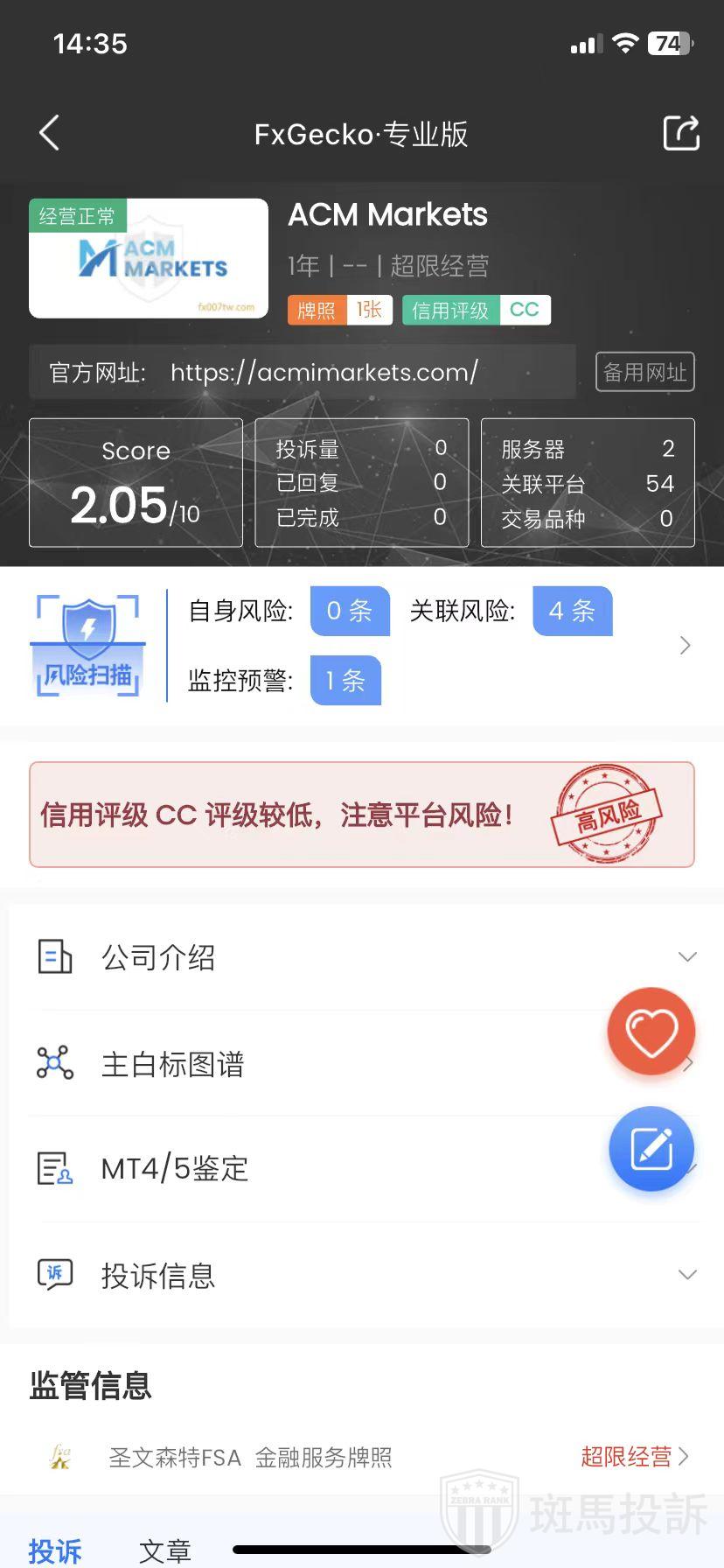 ACM Markets,FxGecko评分2.05分,信用评级较低,建议投资者远离!