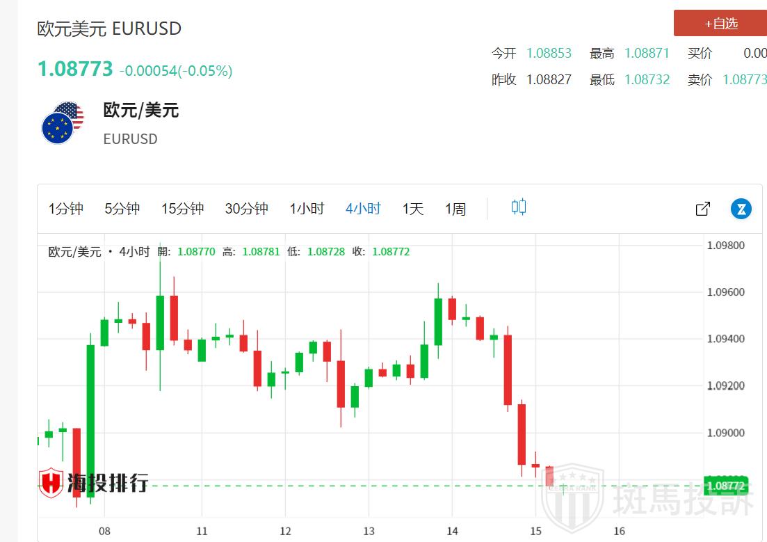 在美元走强的背景下,欧元/美元触及周线低点1.0872。