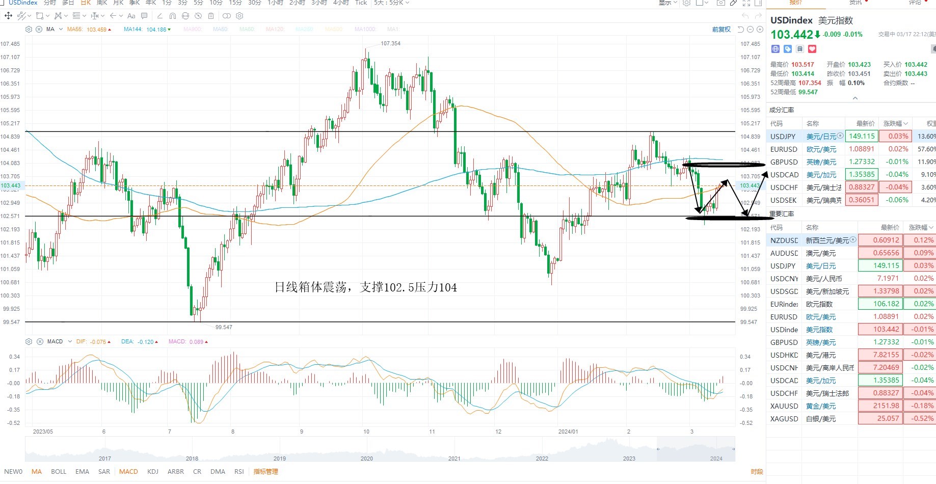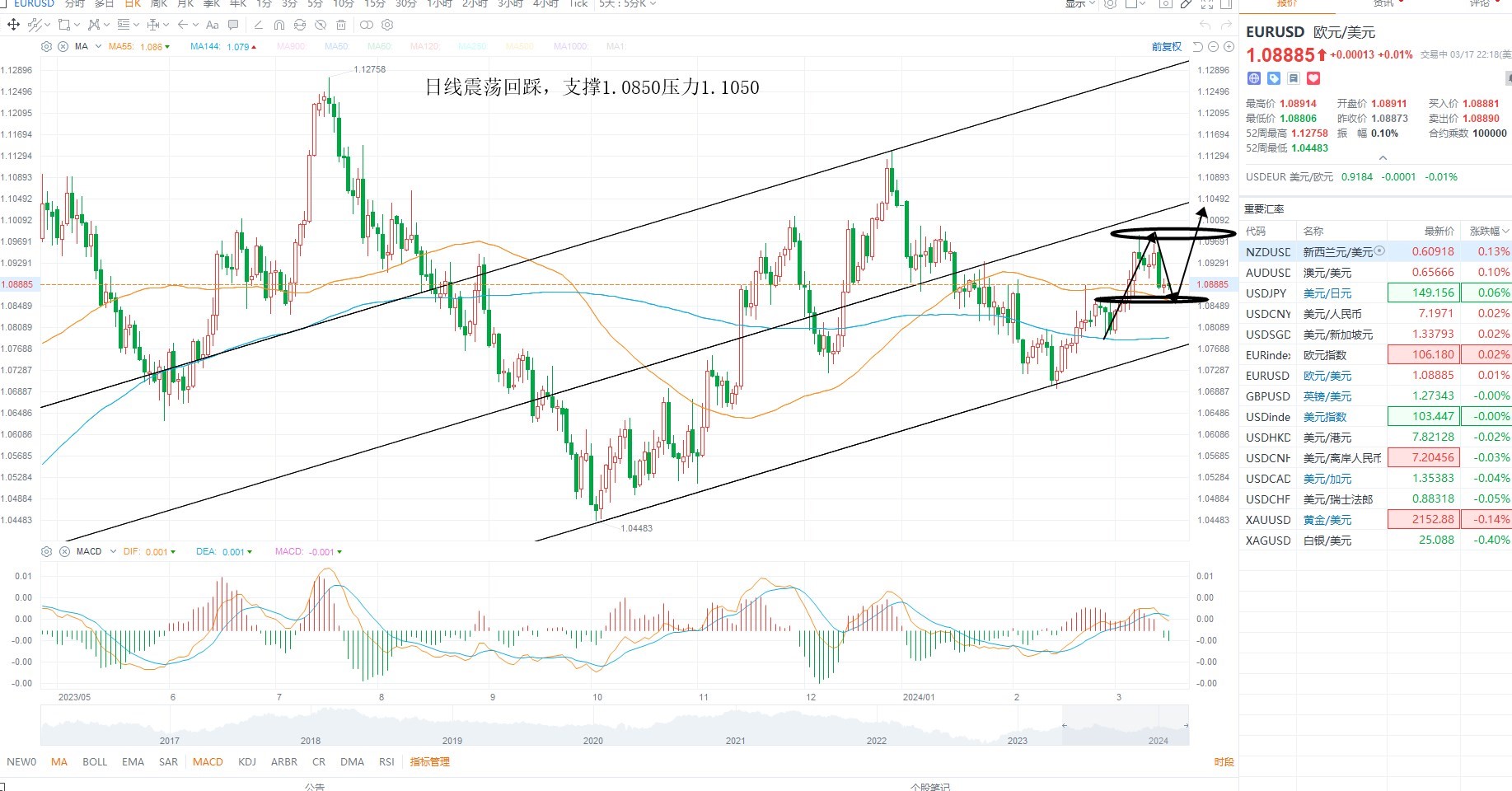 欧美冲高回落,短期继续调整,基本面上美元指数超跌修正,叠加美国通胀数据支撑美元反弹,因此非美回踩均线支撑,本周重点关注美联储利率决议落地之后降息预期的变化,欧美日线级别多空分水岭1.0850不破,则等待低吸机会,上方压力1.1050附近