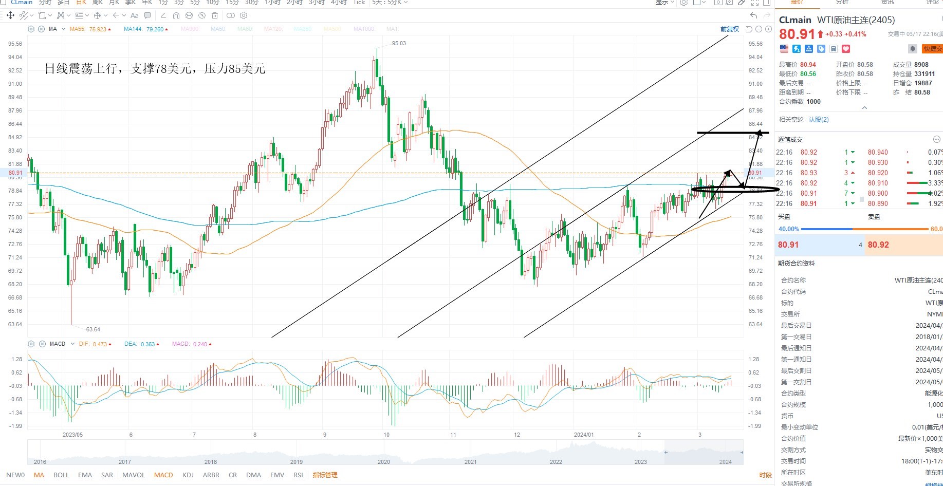 美原油震荡上行,突破收敛压力,基本面上EIA提高需求预期,虽然库存有所下行,但在美国通胀担忧情绪再起的背景之下,油价有望继续走强,日内等待回踩低吸为主,日线级别支撑78美元回踩不破,则多头结构延续,上方压力85美元附近