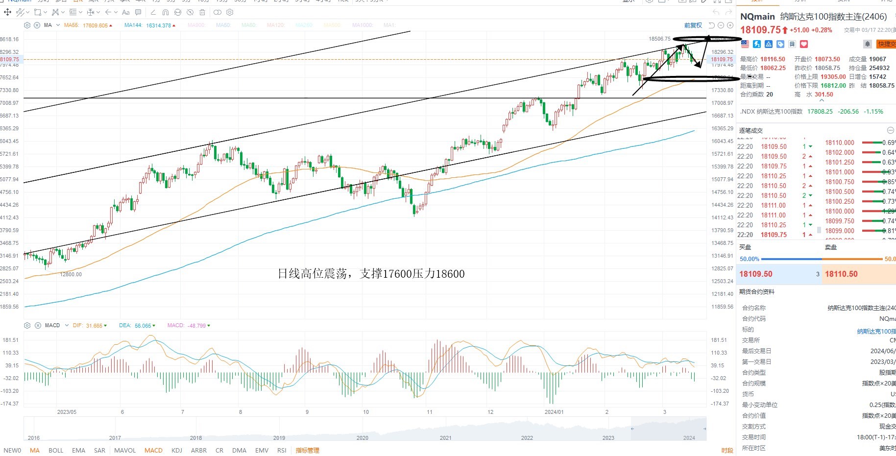 纳斯达克指数维持高位震荡,目前并未突破通道压力,而市场风偏下行,美元指数反弹,对于美联储的降息预期有所缓和,且权重内部分化,整体结构维持震荡对待,日线级别多空分水岭17600不破,等待低吸,上方压力18600附近