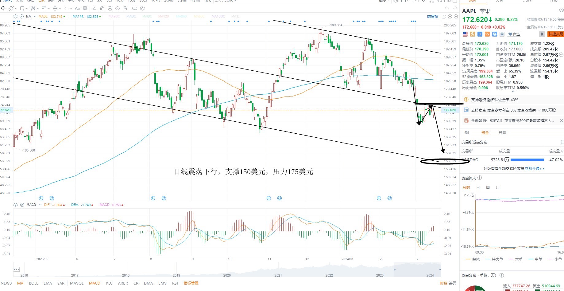AAPL小幅震荡,目前并未突破下降通道中轴线压力,基本面上分子端业绩增速依然是限制估值走高的重要原因,同时指数存在调整的可能性,因此等待压力测试之后的沽空机会为主,日线级别多空分水岭175美元附近,下方支撑150美元