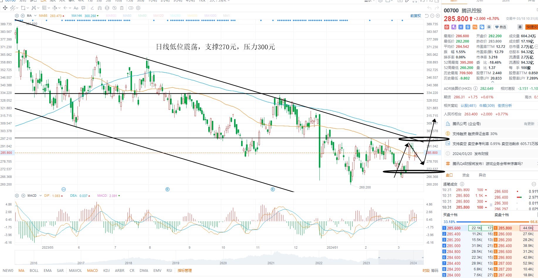 腾讯控股维持区间震荡,目前并未突破收敛区间压力,且指数并未进入右侧,市场流动性尚未完全回暖,整体结构等待突破之后的加速机会为主,日线级别多空分水岭270元附近,等待低吸,上方压力300元,突破则进入多头加速阶段