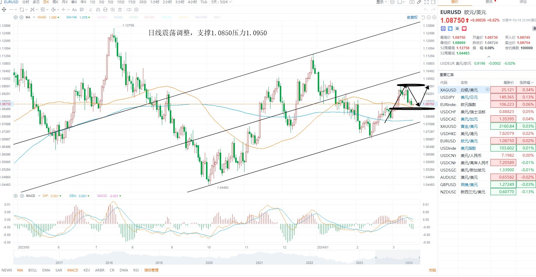 欧美短期震荡回调,主要是美元指数反弹,不利非美走强,同时美联储降息预期缓和,美元有望再次测试箱体上沿压力,日内等待压力测试之后的方向选择,非美等待企稳为主,欧美日线级别支撑1.0850不破,则等待低吸,上方压力1.0950