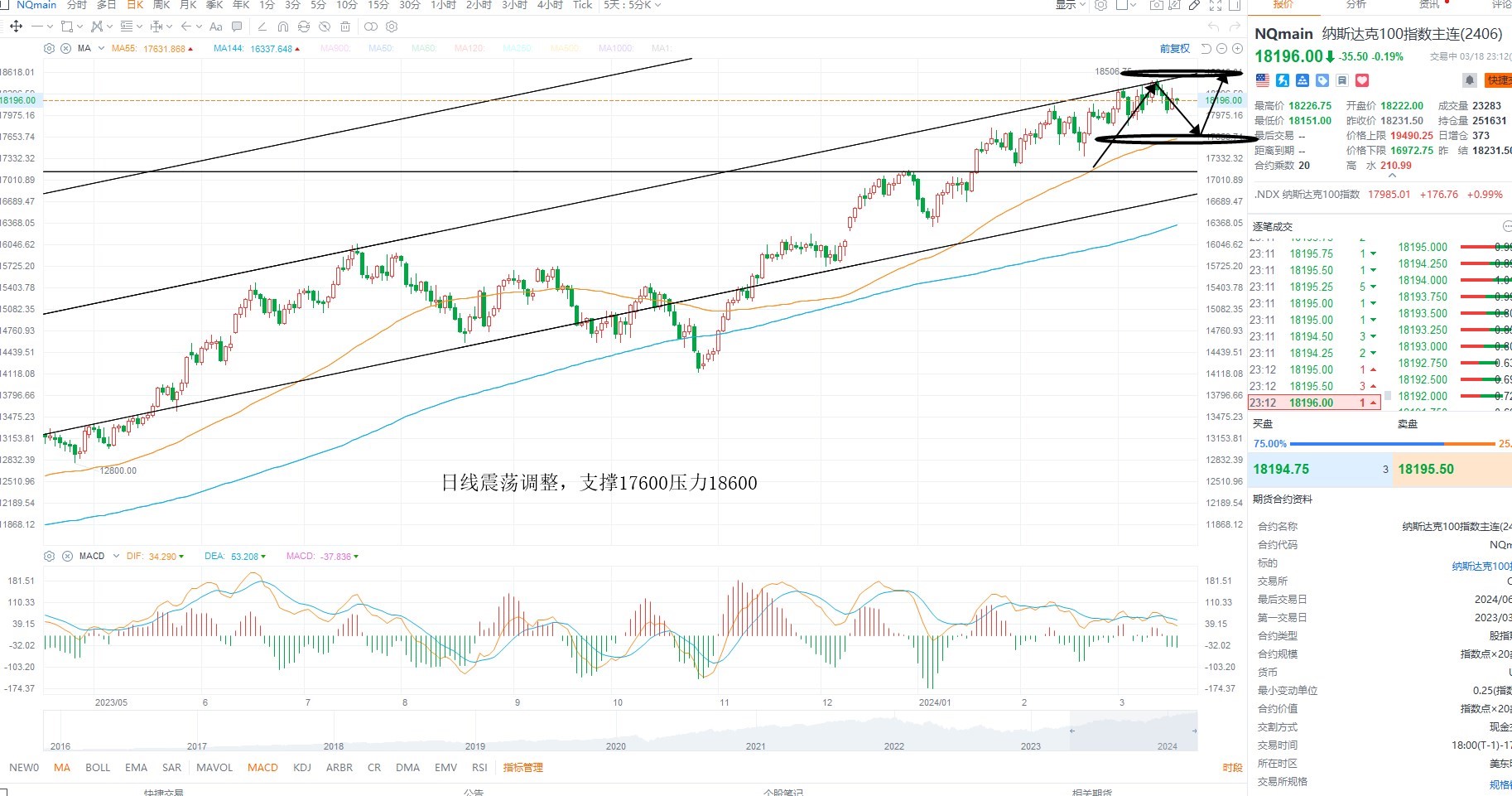 纳斯达克指数维持高位震荡,目前基本面上风偏有所变化,同时权重分化调整,结构上需要等待调整之后的共振机会,目前指标存在修正的需求,日线级别多空分水岭17600不破,则等待企稳低吸,上方压力18600附近