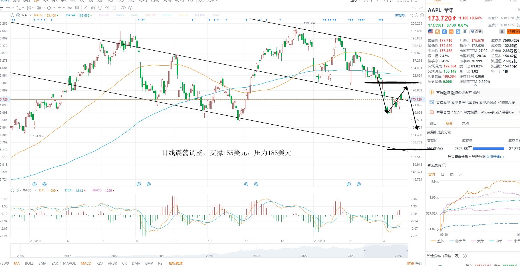 AAPL冲高回落,短期再次回到中轴线上方,但指数存在调整的需求,因此结构上依然维持空头下行,且均线即将形成空头排列,日内等待沽空机会为主,上方多空分水岭185美元无法站稳,则震荡下行不变,下方支撑155美元附近