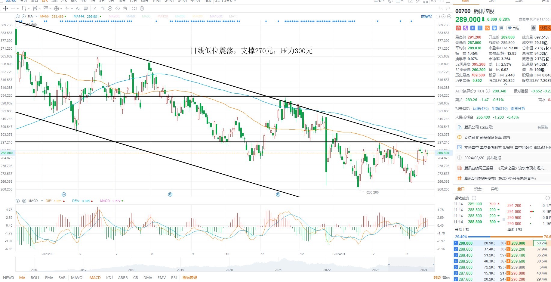 腾讯控股短期依然是低位震荡,目前并未出现明确的突破的迹象,同时指数维持中枢运行,在流动性没有进一步回暖之前,权重共振突破的概率并不大,日内高抛低吸为主,日线级别多空分水岭300元,下方支撑270元。