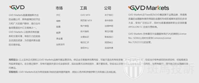 2、GVD Markets 隶属于一家屡获殊荣的塞浦路斯金融经纪商GVD Group。公司持有塞舌尔金融服务局(FSA)的牌照(License No.: SD061)同时也受到Comoros(License No.: T2023331)的监管。