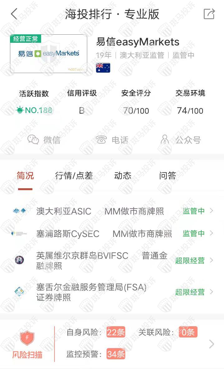 据海投排行资料显示,easyMarkets易信平台成立于2003年,全球排名188名,目前有4个监管,分别是澳大利亚ASIC、塞浦路斯CySEC、英属维尔京群岛BVIFSC和塞舌尔FSA,有外汇牌照,能做外汇保证金交易,风险扫描显示56条风险,投资者资金安全有一定保障。