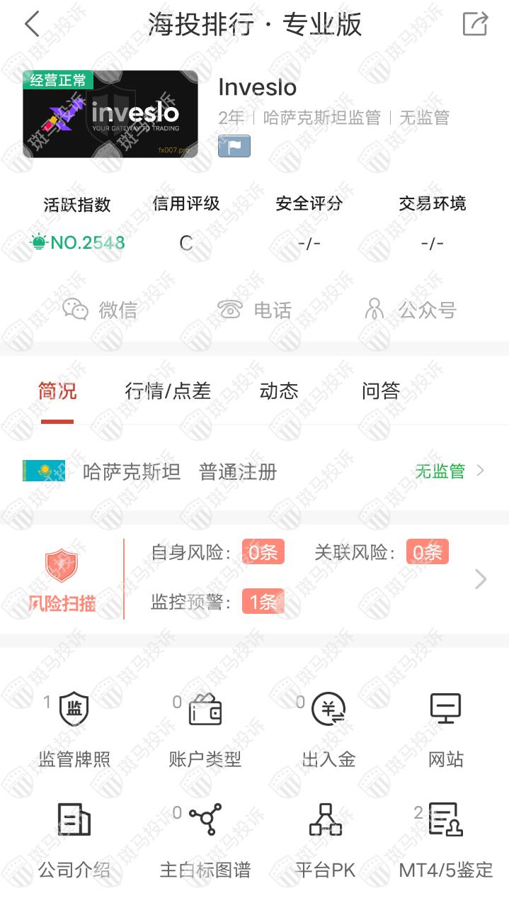 这家平台叫Inveslo,成立于2020年,全球排名2548名,目前无监管,没有外汇牌照,不能做外汇保证金交易,风险扫描显示1条风险,投资者资金安全无保障。