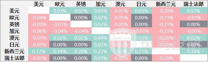 下表显示了今日澳元兑主要货币对价格波动百分比。澳元兑加元汇率最强。