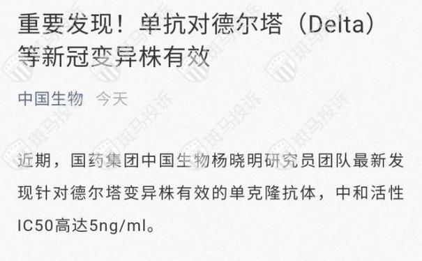 8月4日,国药集团中国生物官微发文称,近期,国药集团中国生物杨晓明研究员团队最新发现针对德尔塔变异株有效的单克隆抗体,中和活性IC50高达5ng/ml。这意味着,单抗对德尔塔(Delta)等新冠变异株有效,新冠肺炎治疗有望迎来特效药。