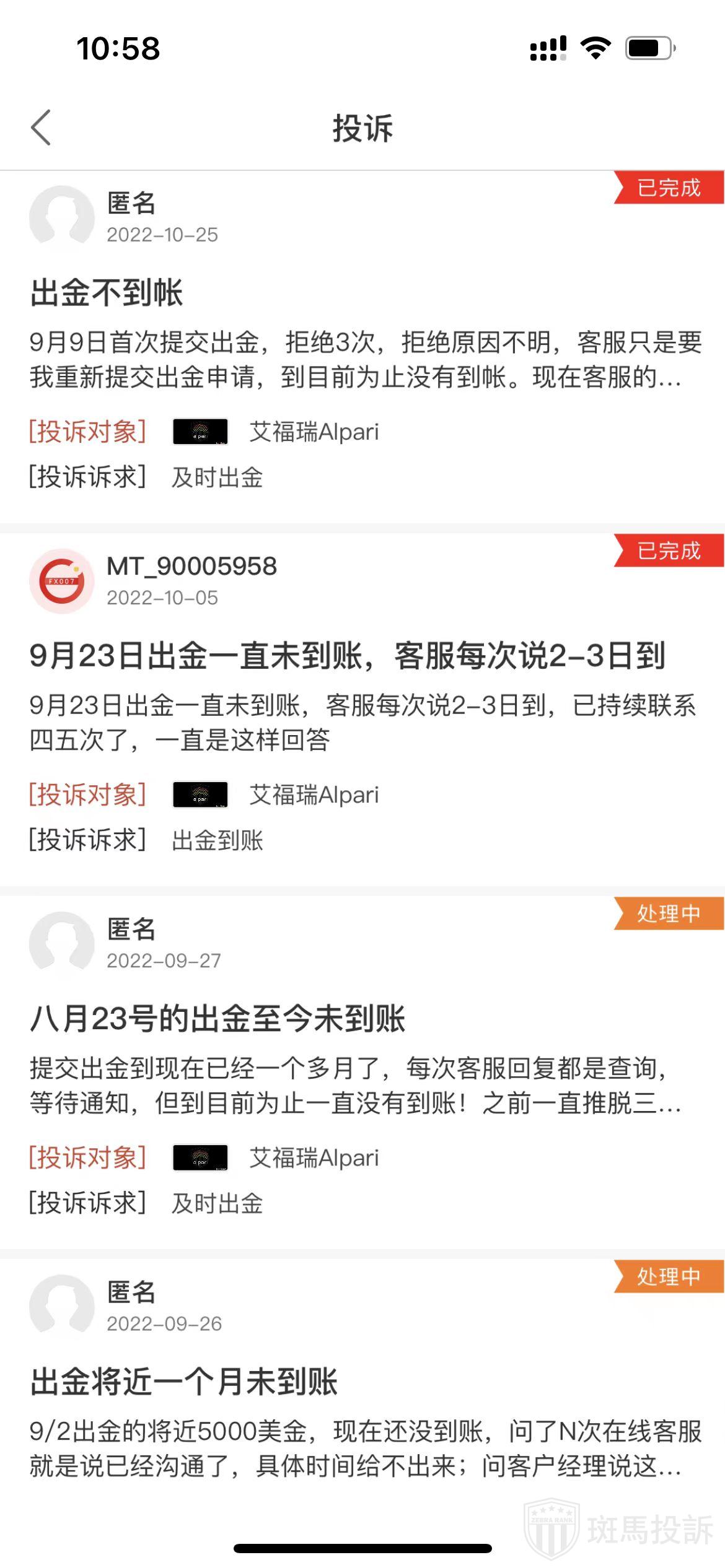 艾福瑞Alpari在斑马投诉中有22条投诉,其中22条投诉均在处理中,均未回复处理。