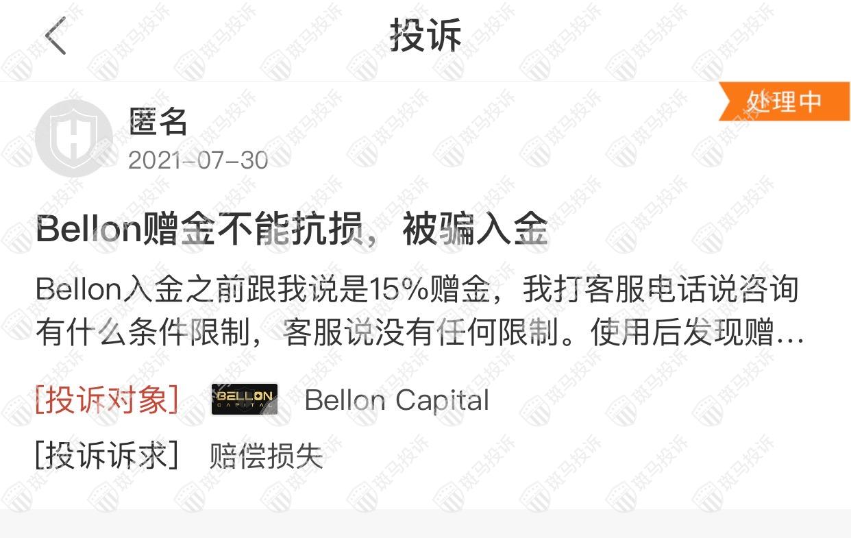 Bellon Capital平台现在在斑马投诉有1条投诉,并且还在处理中。