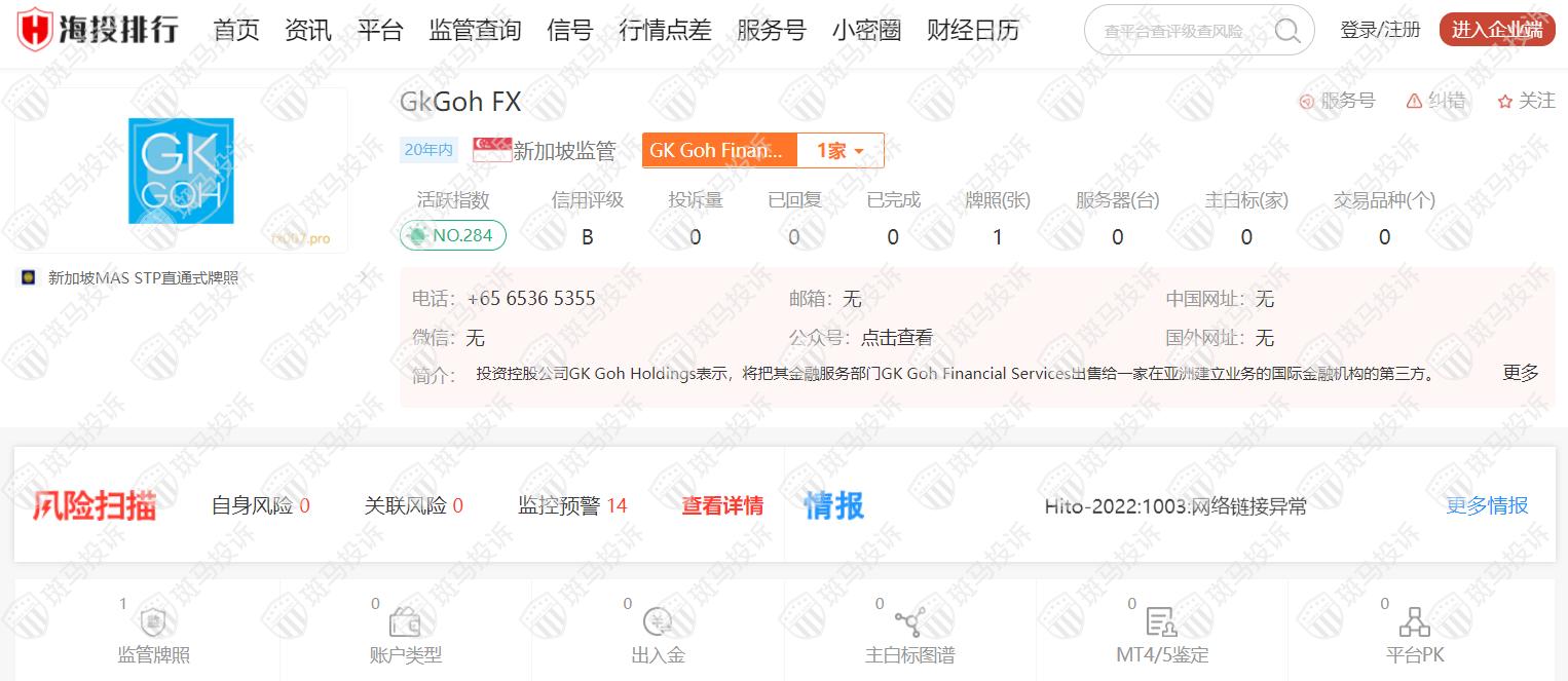 这家平台叫GkGoh FX,成立于2002年,全球排名284名,受新加坡MAS监管,有STP直通式牌照,风险扫描显示14条风险,投资者需注意其风险信息。