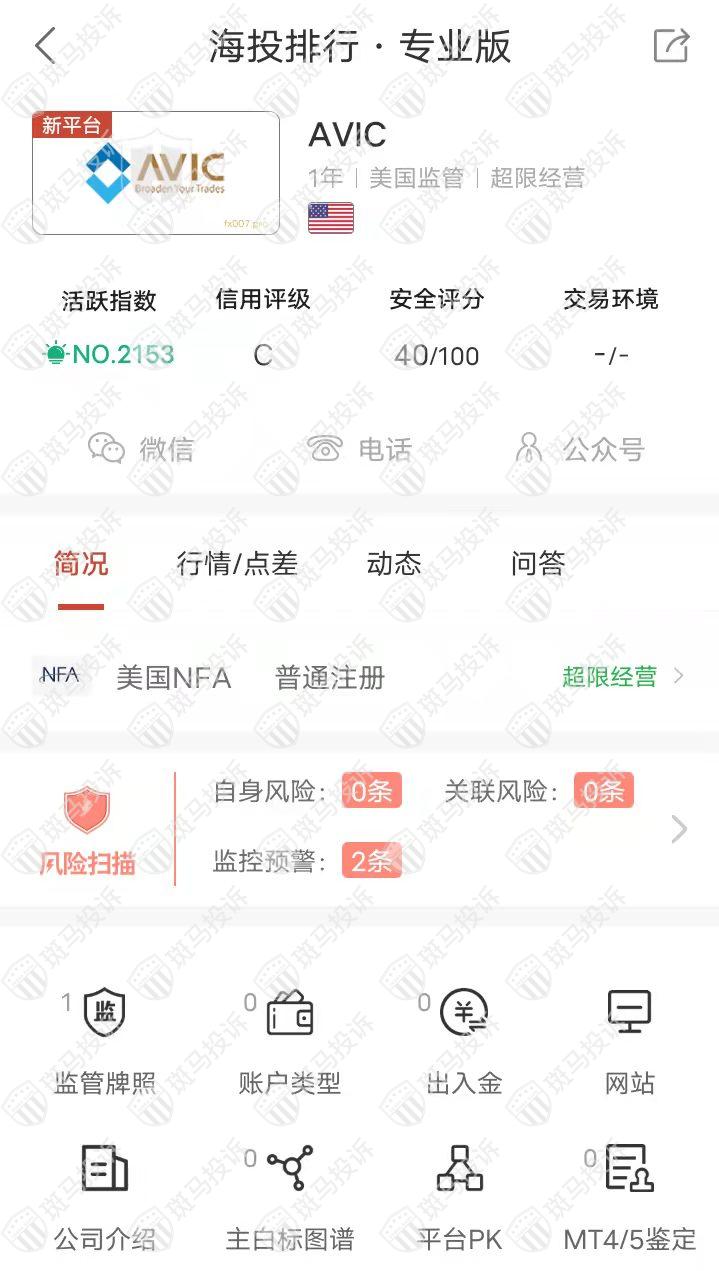 这家平台叫AVIC,成立于2021年,全球活跃指数2153名,目前有1个美国NFA监管,但是只是普通注册,没有外汇牌照,不能做外汇保证金交易,风险扫描显示2条风险,投资者资金安全无保障。
