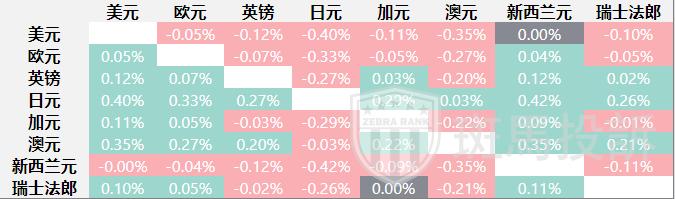 热图显示了主要货币之间的百分比变化。基准货币从左列选取,报价货币从顶行选取。例如,如果您从左列选择澳元,然后沿水平线移动到美元,方框中显示的百分比变化将代表澳元(基准)/美元(报价)。