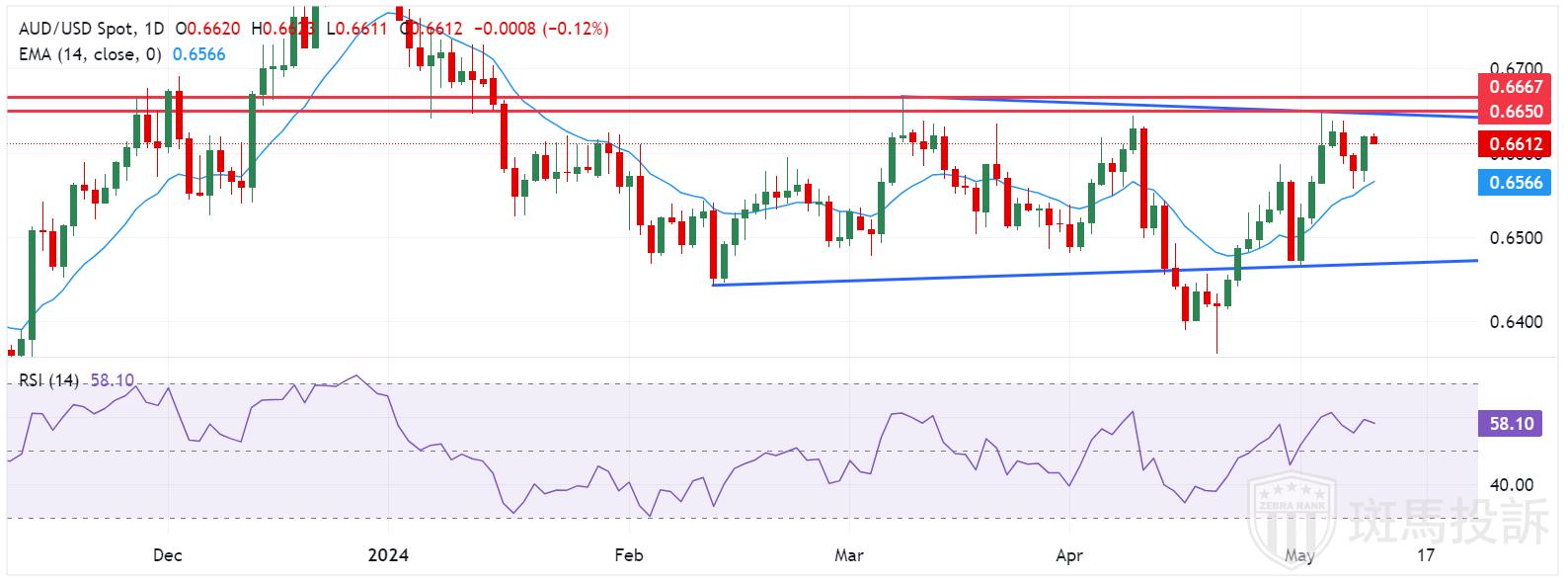 澳元周五交投于 0.6610 附近。澳元/美元货币对在对称三角形形态内盘整,14天相对强弱指数(RSI)徘徊在50水平上方,显示看涨倾向。