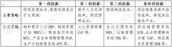 如表1所示,从第一到第四利润源,每一阶段都有各种系统在信息处理、存储和管理中的支撑,例如生产执行管理系统MES,企业资源管理ERP,仓储管理系统WMS,供应链管理系统SCM等等。